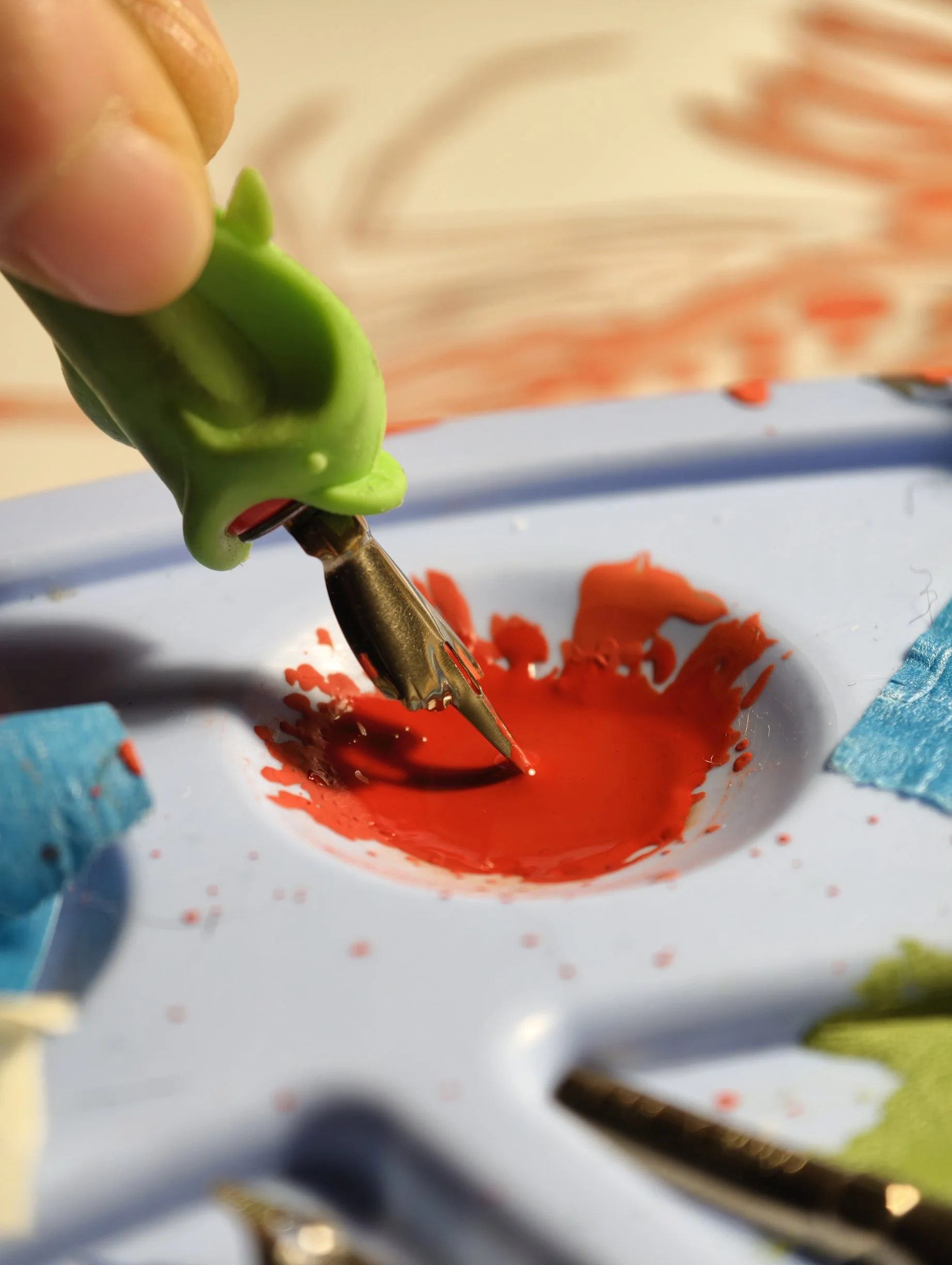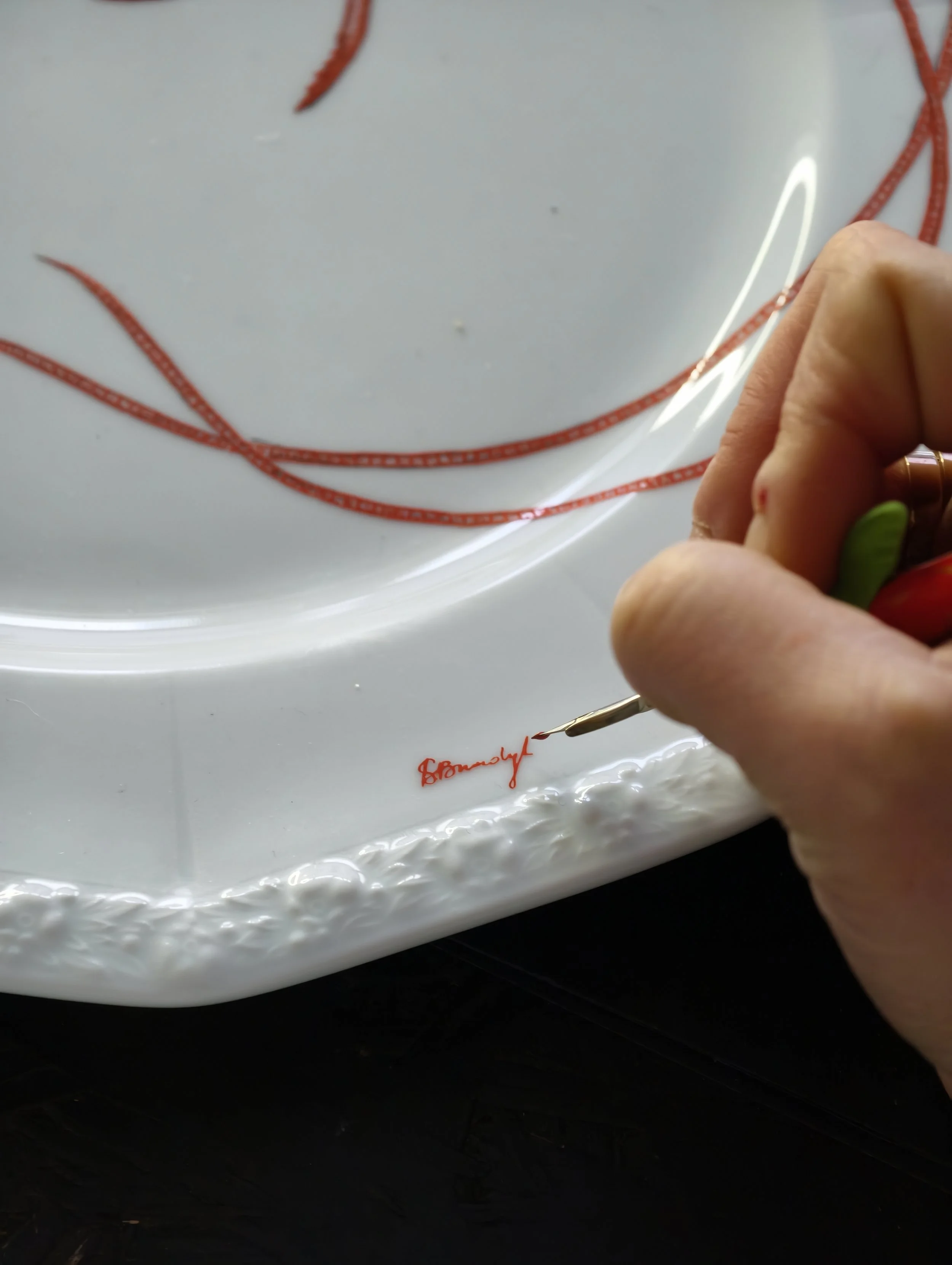 Every line is drawn by hand with a technical nib using overglaze paints, then fired in a ceramic kiln — a process that makes each piece not only permanent but fully food-safe and ready to be lived with.